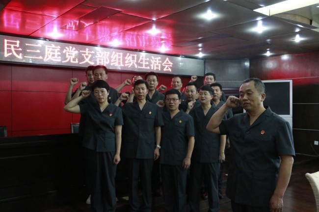 随后,简立存向新加入支部的干警介绍了民三庭党支部的工作情况,并带头进行自我批评。全庭党员分为两个审判团队,从政治理论学习,遵守工作纪律,司法礼仪,大局意识,宣传调研等方面,进行了全方位的批评和自我批评。最后,简立存庭长对结案率,流程信息录入,裁判文书上网,庭审直播等方面的工作作出了安排部署。