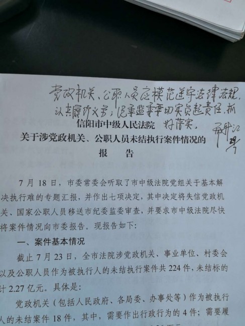 7月29日,省人大常委会副主任、市委书记乔新江对《信阳市中级人民法院关于涉党政机关、公职人员未结执行案件情况的报告》作出批示:党政机关、公职人员应模范遵守法律法规,认真履行法院生效裁判确定的义务,发挥示范带动作用;纪委监委要切实负起责任,抓好落实。