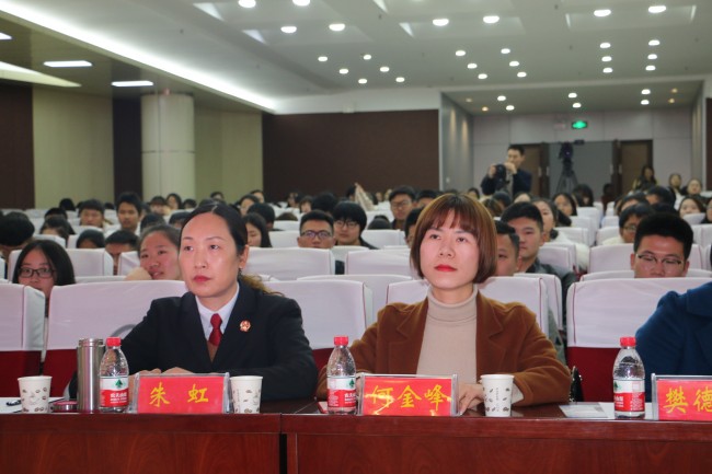 11月26日,信阳中院刑三庭庭长朱虹、助理审判员何金峰一行受邀观摩指导信阳师范学院青年法学会组织的模拟法庭活动。