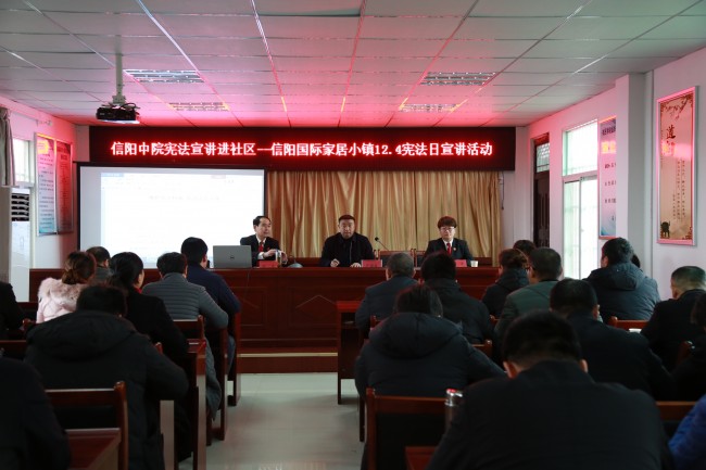 时值第五个“12·4”国家宪法日,为进一步掀起学习贯彻宪法热潮,信阳中院政治部副主任金波应邀赴信阳国际家居产业小镇社区开展宪法宣讲活动。家居小镇管理办公室全体干部、辖区居委会干部及部分辖区居民参加活动。活动由家居小镇社区管理办公室党工委书记卢国武主持。