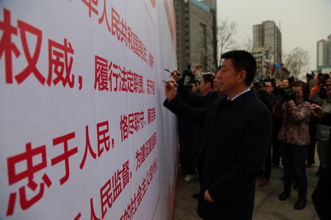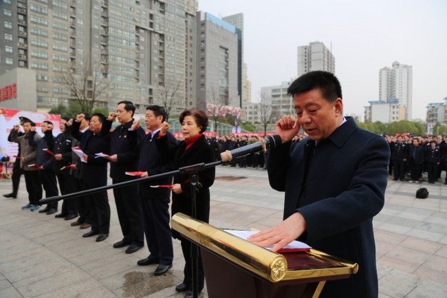 此次活动以“尊崇宪法、学习宪法、遵守宪法、维护宪法、运用宪法”为主题。活动现场,张新中作为领誓人,带领全市70余家单位的干部及政法干警代表向宪法庄严宣誓,随后政法干警代表向市民发出学习宣传宪法精神倡议。信阳市委常委、政法委书记孙同占带领市直各政法单位主要负责人及广大市民在留言板签名留言。