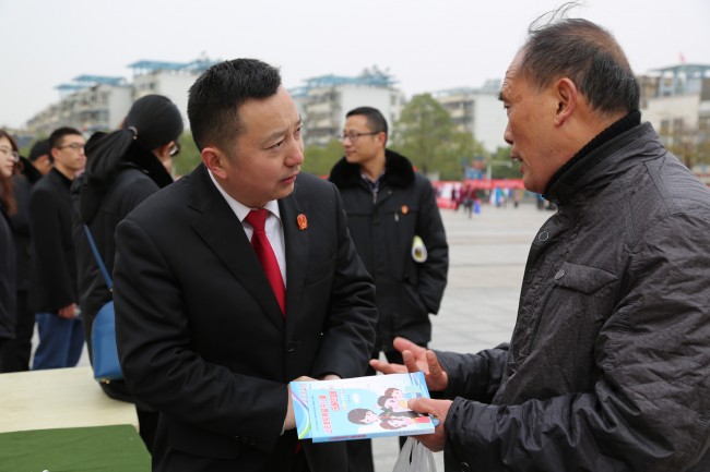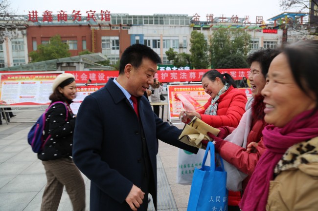 “我宣誓,忠于中华人民共和国宪法,维护宪法权威,履行宪法职责……”,庄重的宪法宣誓声响彻信阳市体彩广场。12月4日是第五个国家宪法日,为提升全民宪法意识,营造全社会尊法学法守法用法的浓厚氛围,信阳中院党组书记、院长张新中带领中院20余名干警参加市普法办组织的2018年信阳市“宪法宣传周”广场宣传活动。