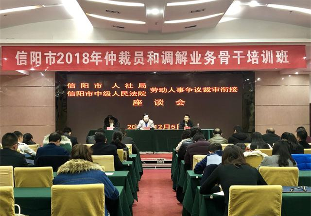 12月5日,在信阳市2018年仲裁员和调解业务员骨干培训班上,信阳市人社局联合信阳市中级人民法院召开关于劳动人事争议裁审衔接座谈会。信阳中院专职审委会委员徐鸿、民三庭副庭长吴孔玉参加会议。