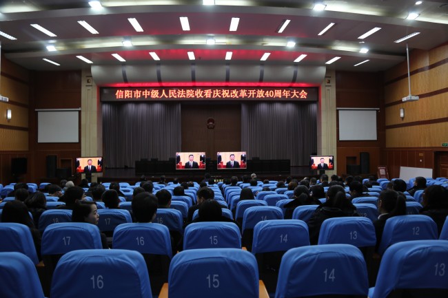 12月18日上午10时,庆祝改革开放40周年大会在人民大会堂举行。中共中央总书记、国家主席、中央军委主席习近平出席大会并发表重要讲话。信阳中院组织全体干警收看 “庆祝改革开放40周年大会”。