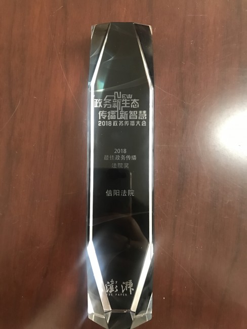 近日,澎湃新闻“政务新生态·传播新智慧”2018政务传播大会在上海召开,大会现场颁发2018年度澎湃政务传播力奖,其中信阳法院获评 “最佳政务传播法院奖”。据悉,全省法院系统仅有河南省高级人民法院和信阳中院获此殊荣。