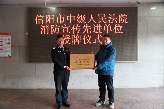 近日,省消防协会评选表彰2018年度河南省消防安全宣传先进单位及先进个人活动结果出炉,信阳中院荣获2018年度河南省消防安全宣传先进单位。1月16日,河南省消防协会消防宣传服务中心教员詹杰到中院发放奖牌,行装处相关负责人参加授牌仪式。