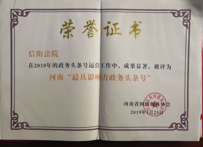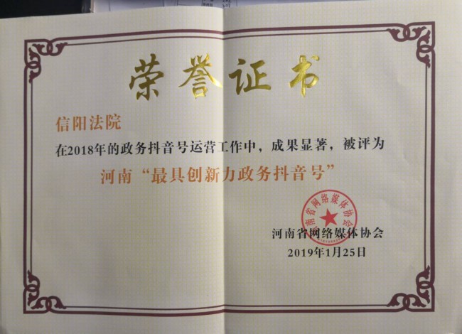 1月25日,由河南省委网信办指导,河南省网络媒体协会主办的“网聚正能量 河南更出彩”2019年河南省政务新媒体峰会在郑州举行,来自省直和全省有关市县(区)的145家政务新媒体单位参会。河南省委网信办主任郭岩松出席会议并致辞。会上发布全省2018年度微博、微信等新媒体获奖榜单并现场颁奖。信阳中院官方头条政务号、官方抖音号分别荣获2018年度“河南最具影响力政务头条号”和“河南最具创新力政务抖音号”两项大奖。