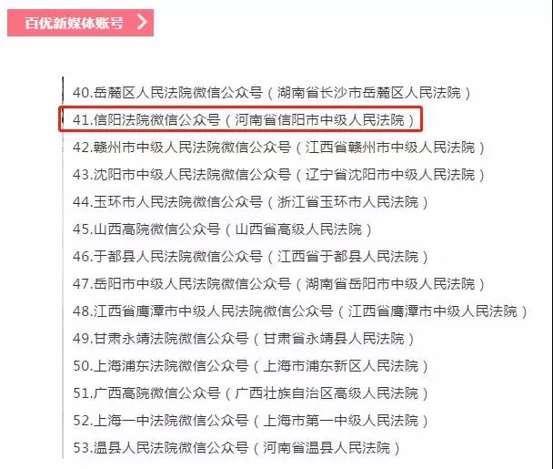 近日,在最高人民法院政治部、最高人民法院新闻局和人民法院新闻传媒总社联合发布的2018年度全国法院“十佳百优”新媒体账号和作品榜单中,@信阳法院微信公号获评2018年度全国法院“百优新媒体账号”