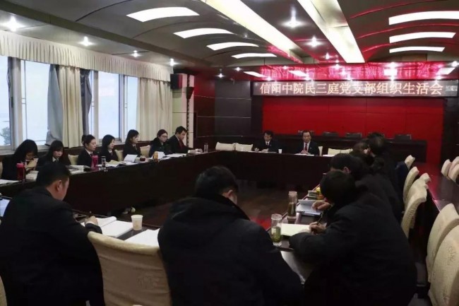 简庭长送走案件当事人后,匆匆赶到三楼会议室,民三庭党支部3月份支部会正在召开。