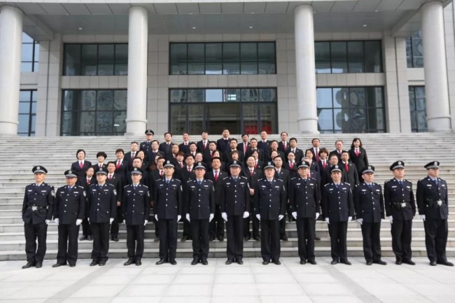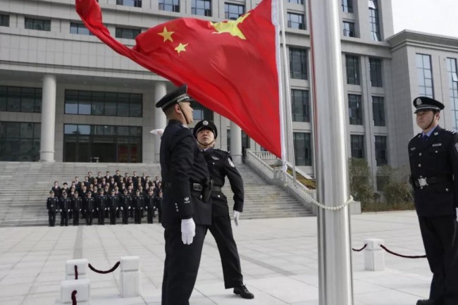 上午9时,干警们整齐有序地列队集结,法警队法警护卫国旗入场,随着国歌奏响,鲜艳的五星红旗在新址上空冉冉升起,干警们行庄严肃穆的注目礼。