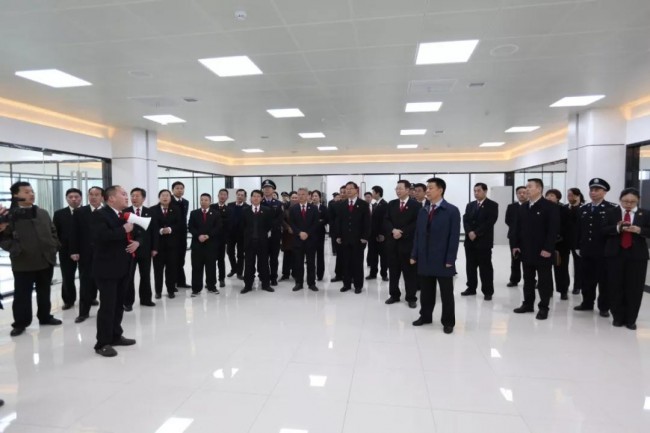 升旗仪式结束后,张新中院长带领干警们参观安检大厅、诉讼服务大厅,智慧化审判庭、执行指挥中心、远程视频会议室、档案室等,中院行装处处长何啸为大家全程讲解介绍。参观中,张新中院长对审判综合楼建设提出完善建议,并要求加快工程进度,配齐相关设施设备,力争尽快达到使用标准,为诉讼群众提供高效优质的司法服务。