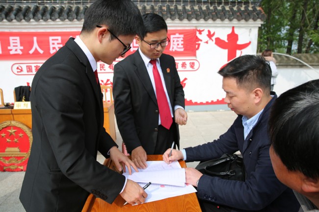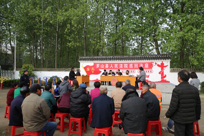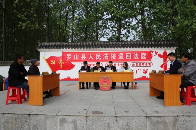 08:30 在罗山县楠杆镇田堰村村部文化广场,四张桌子,几条凳子,一个简易的巡回法庭布置停当。随着一声清脆的法槌声,董王超在这里巡回开庭审理一起因相邻建房矛盾引发打架受伤的健康权纠纷案。
