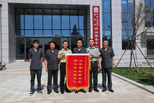 一桩难心事,信阳中院不到一个月调解解决。姜武心存感激,本想向中院赠送锦旗表示感谢,但因单位有任务庭审当日便返回了部队。这一年多来,向信阳中院和涉军维权法庭法官们当面致谢便成了他一桩心事。直到2019年7月1日,姜武趁着休假间隙,联系信阳军分区,在军分区干事韩玉鹏的陪同下,向市中院赠送锦旗。