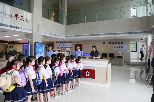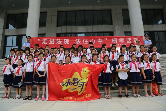 8月21日上午,信阳中院组织开展“法院公众开放日”活动,信阳市第三小学2017级13班50余名师生应邀参加活动。在中院刑三庭副庭长、员额法官陈鑫讲解引导下,同学们相继参观中院立案一庭、刑事审判庭、法警支队、办公室、行政装备管理处等部门,开启一段法治主题的暑期研学之旅。