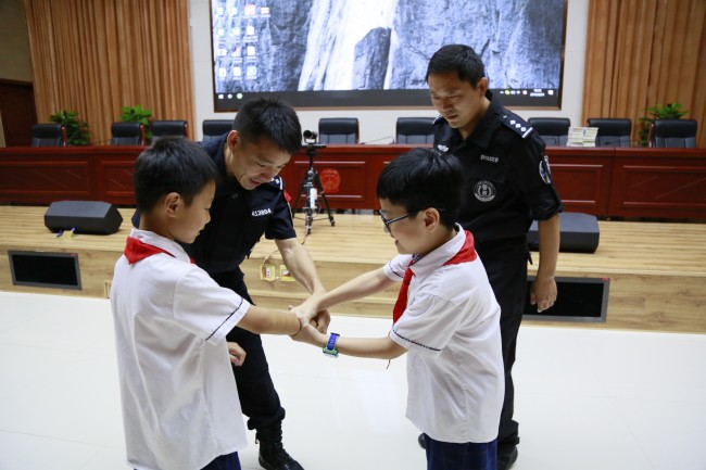 参观结束后,在中院三楼多功能会议室,师生们观看了由罗山法院拍摄的环境资源保护微电影《鸟的天堂》,寓教于乐地学习关于环境资源保护的法律知识。随后,中院法警支队法警周广华、郑海宽分别为同学们表演实战擒敌拳及应急棍术,并现场教授自卫防身术,赢得同学们的阵阵喝彩。干警们向同学们赠送普法漫画书,用讲故事的形式普及防范性侵及校园暴力等的相关法律知识,作为此次暑期研学活动 “法治”礼物。同学们也纷纷将自己亲手制作的纪念卡片送到法官手中,对法官们辛勤的工作与付出表达感谢之情。集体合影留念后,同学们依依不舍地离开了法院。