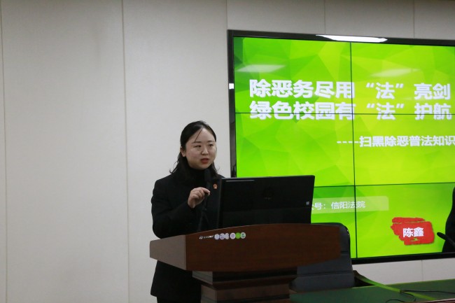 “法律是最杰出的智慧,世世相继,代代相承,由人类经久不断的经验和理性构成,经由阳光与真理的检验,精致而优雅。没有人比法律规定更聪明,立法者也没有法律聪明,所以我们一定要信仰法律,遵守法律。”11月18日下午,信阳中院刑三庭员额法官陈鑫引用法学家张明楷的名言,以《除恶务尽用“法”亮剑·绿色校园有“法”护航》为题,为信阳职业技术学院的师生们上一堂“扫黑除恶”主题法治课,进一步提升同学们的法律素养和法律意识。