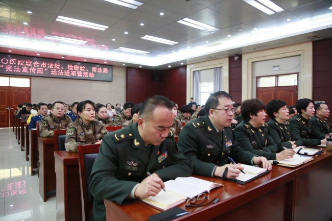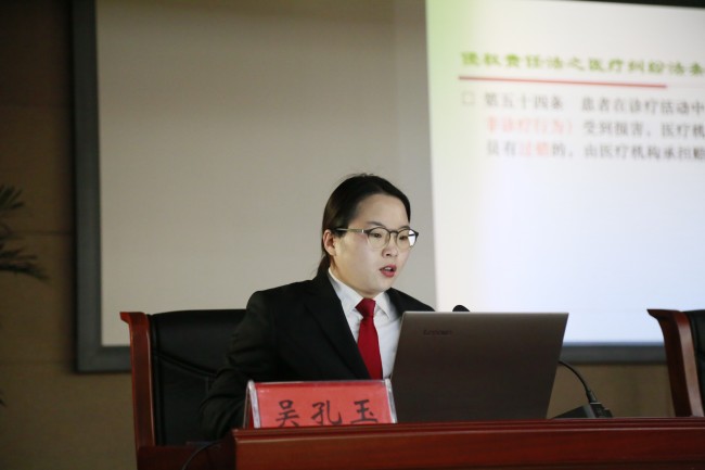 吴孔玉法官结合部队医院的工作实际,从“医疗损害责任”解析,医疗纠纷法条解析、医院容易出现医疗纠纷的环节及如何维权等三个方面,以案说法,为官兵们上了一堂既生动形象又务实管用法治课。法官的精彩讲授赢得现场阵阵掌声。