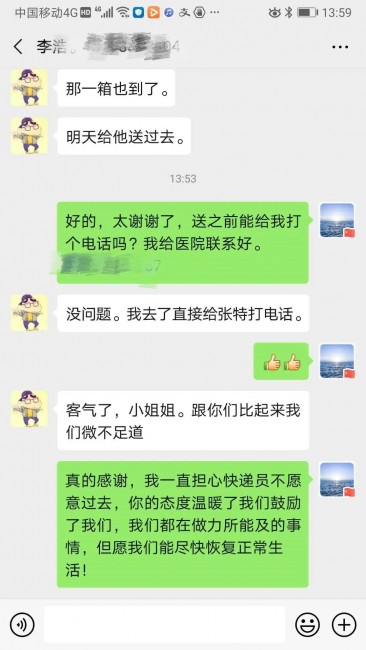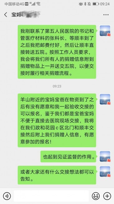 该批医疗物资于2月19日上午到达信阳,为了不给抗疫一线增加负担,宝妈们一致商定由陈鑫作代表验收物资后,再通过邮寄的方式捐赠医院。