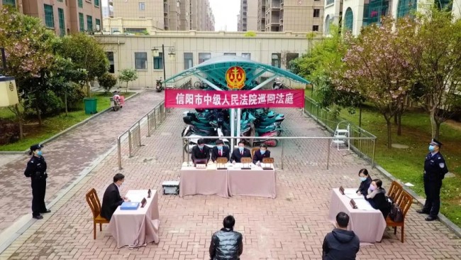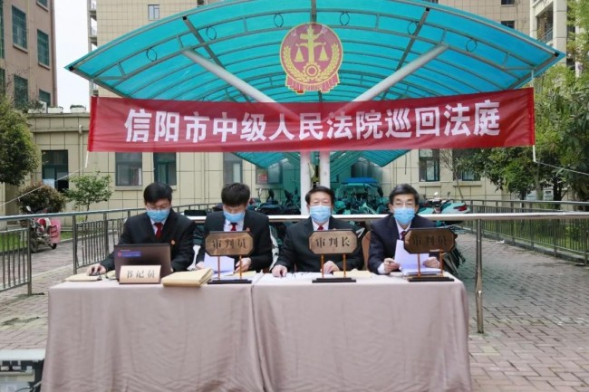 为全力做好新冠肺炎疫情防控期间各项司法服务工作,3月30日下午,信阳中院民一庭干警组成巡回法庭,在该庭庭长蔡红莉的带领下,把庭审移到社区中,把法庭“搬”到小区内,对李某某等50个上诉人与被上诉人信阳某置业有限公司房屋买卖合同纠纷一案进行公开审理。