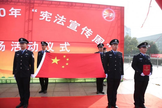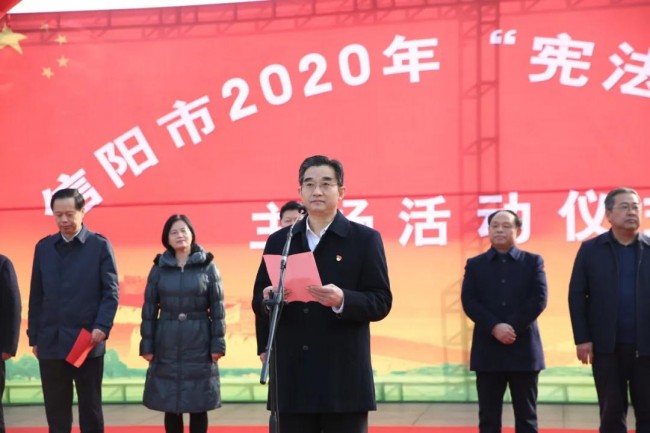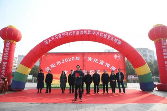 为学习宣传贯彻习近平法治思想,弘扬宪法精神,树立宪法权威,适逢第七个“国家宪法日” ,12月4日上午,信阳市2020年“宪法宣传周”活动启动仪式在体彩广场举行。国家统计局河南调查总队纪检组组长武洁,国家统计局河南调查总队二级巡视员李永仁,市委常委、市委政法委书记谷昌豪,市人大常委会副主任陈延虎等,以及市法院等70余家市普法教育工作成员单位工作人员参加活动。启动仪式由市政府副市长、市公安局局长侯钦东主持。