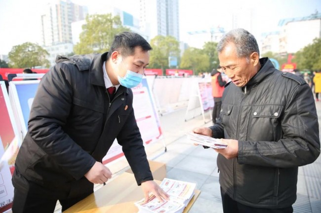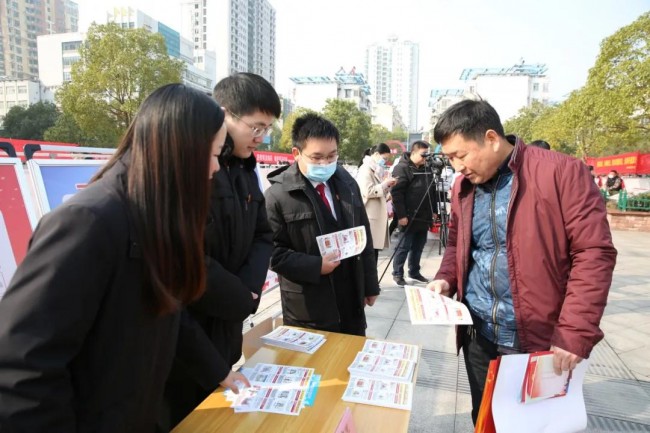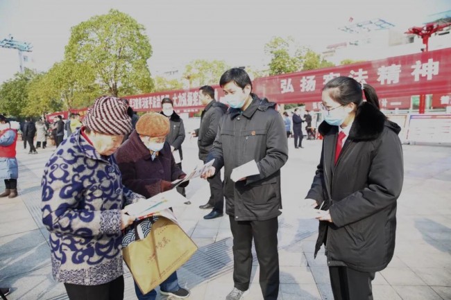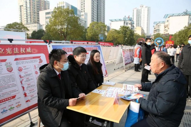 信阳中院选派15余名干警组成普法宣传队,在体彩广场开展“学习贯彻习近平法治思想”主题普法宣传活动。法官们通过摆放宣传展板、悬挂宣传条幅,发放宣传彩页等方式,以法律咨询台为宣传阵地,向来往群众宣传宪法知识。