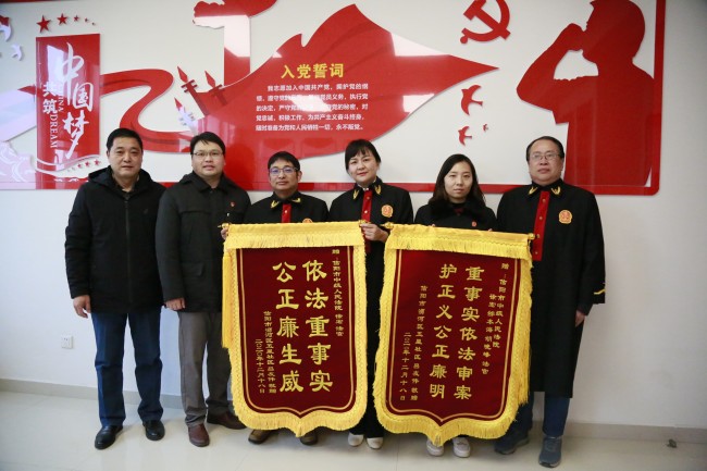 12月25日一大早,一起民间借贷纠纷案件的当事人吕某某来到信阳中院,将两面印有“依法重事实 公正廉生威”、“重事实依法审案 护正义公正廉明”的锦旗送到民二庭员额法官徐宏手中。