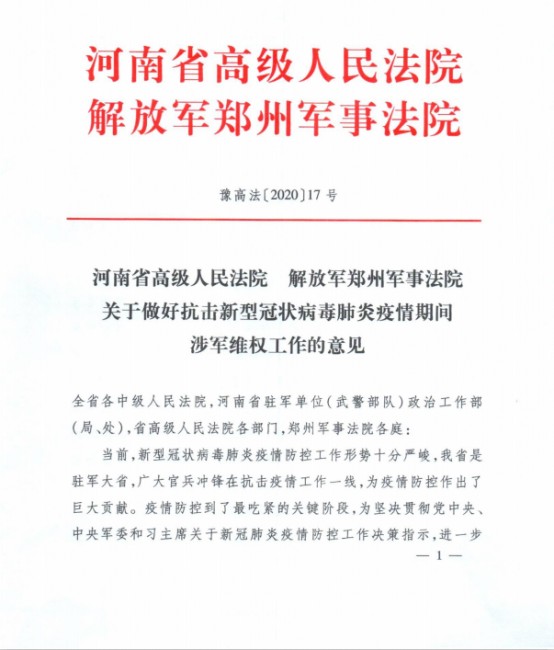 省法院、解放军郑州军事法院联合下发《关于做好抗击新型冠状病毒肺炎疫情期间涉军维权工作的意见》,要求增强责任感使命感,扎实做好涉军案件审判执行工作,积极开展疫情防控期间涉军法律服务,其中信阳两级法院集中开展涉军维权“六个一”活动,受到广大军人军属的好评。