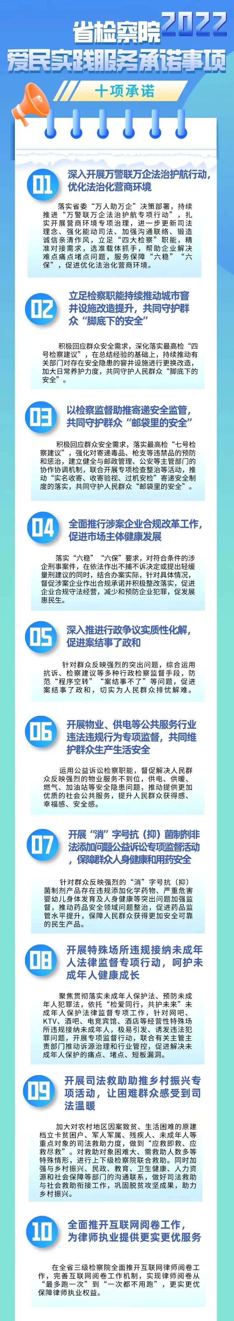 近日,“2022年全省政法系统爱民实践服务承诺活动”正式启动,省法院、省检察院、省公安厅、省司法厅围绕服务大局、为民司法,立足各自职能,推出2022年爱民服务承诺事项,共计38项。