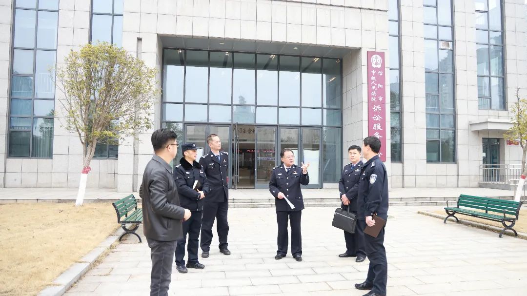上午,王彪一行实地查看了信阳中院警务指挥中心、安检室、“六专四室”和机关重要库房等场所,听取了法警队伍建设、值班备勤、应急处置等工作开展情况。下午,对平桥区法院和浉河区法院游河法庭进行警务安全督查时,总队领导边看边教,现场指出问题并给出具体的意见建议,着力推动信阳法院司法警务安全工作稳步开展。