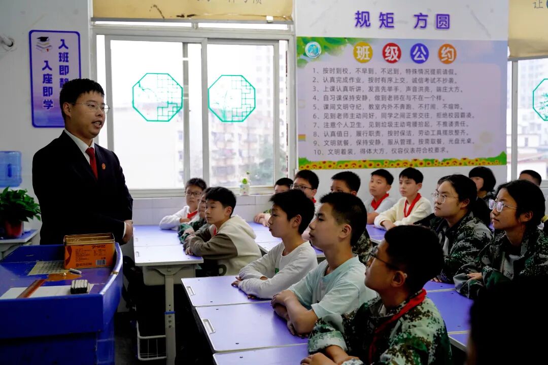 10月9日下午,浉河区法院刑事审判庭干警王涛走进浉河中学,为初一年级的同学们带来了一堂题为 “提高安全意识,预防电信诈骗” 的生动法治课。