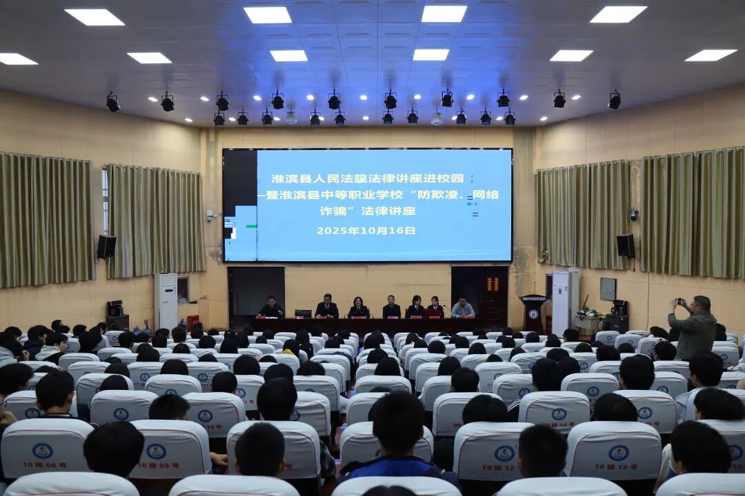 为切实增强青少年法治意识与自我保护能力,营造更加安全稳定的校园环境,10月16日,淮滨县法院党组成员、副院长杜远银与刑事审判庭庭长江法团一行走进县中等职业学校,开展以“防欺凌、防网络诈骗”为主题的普法宣讲活动。