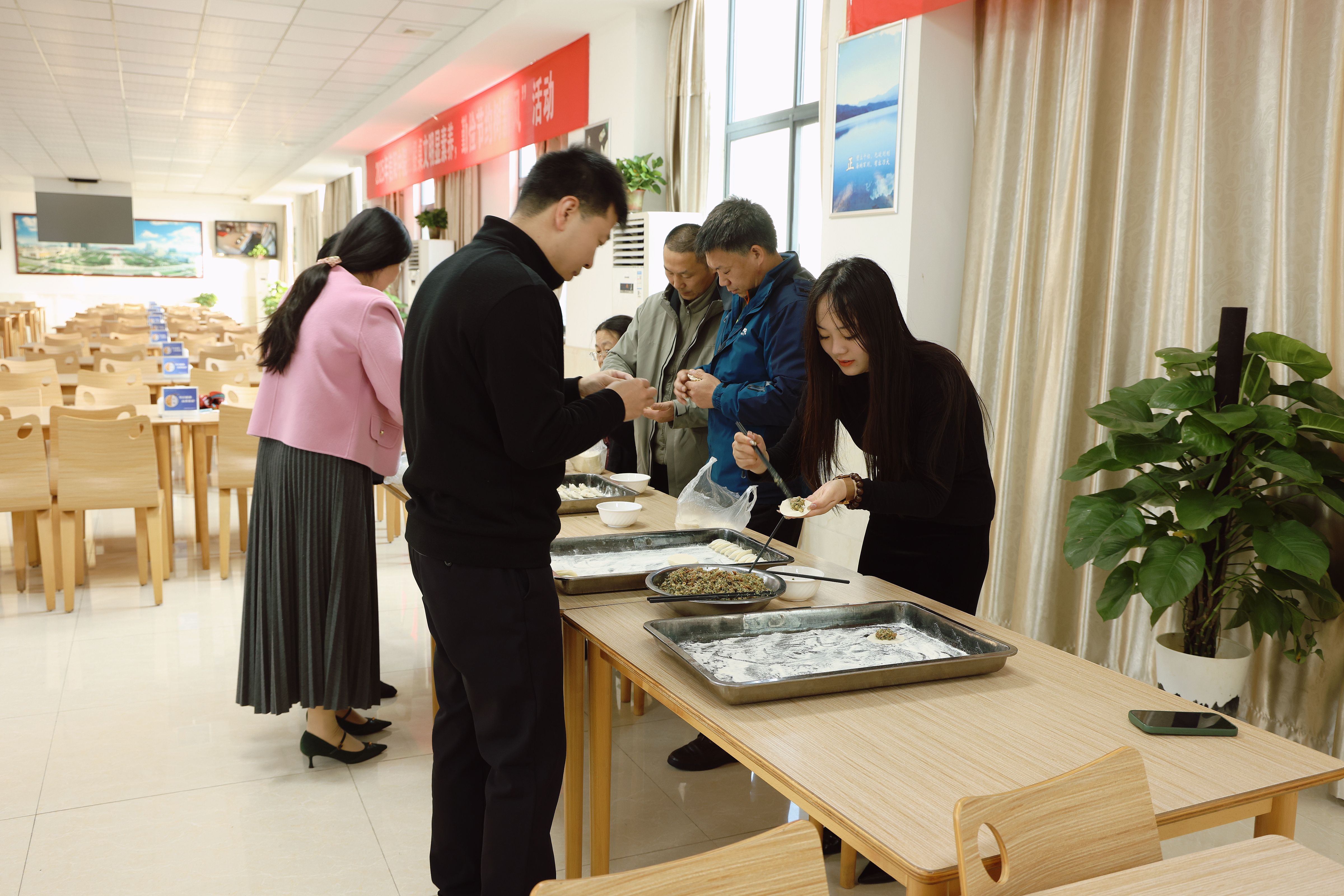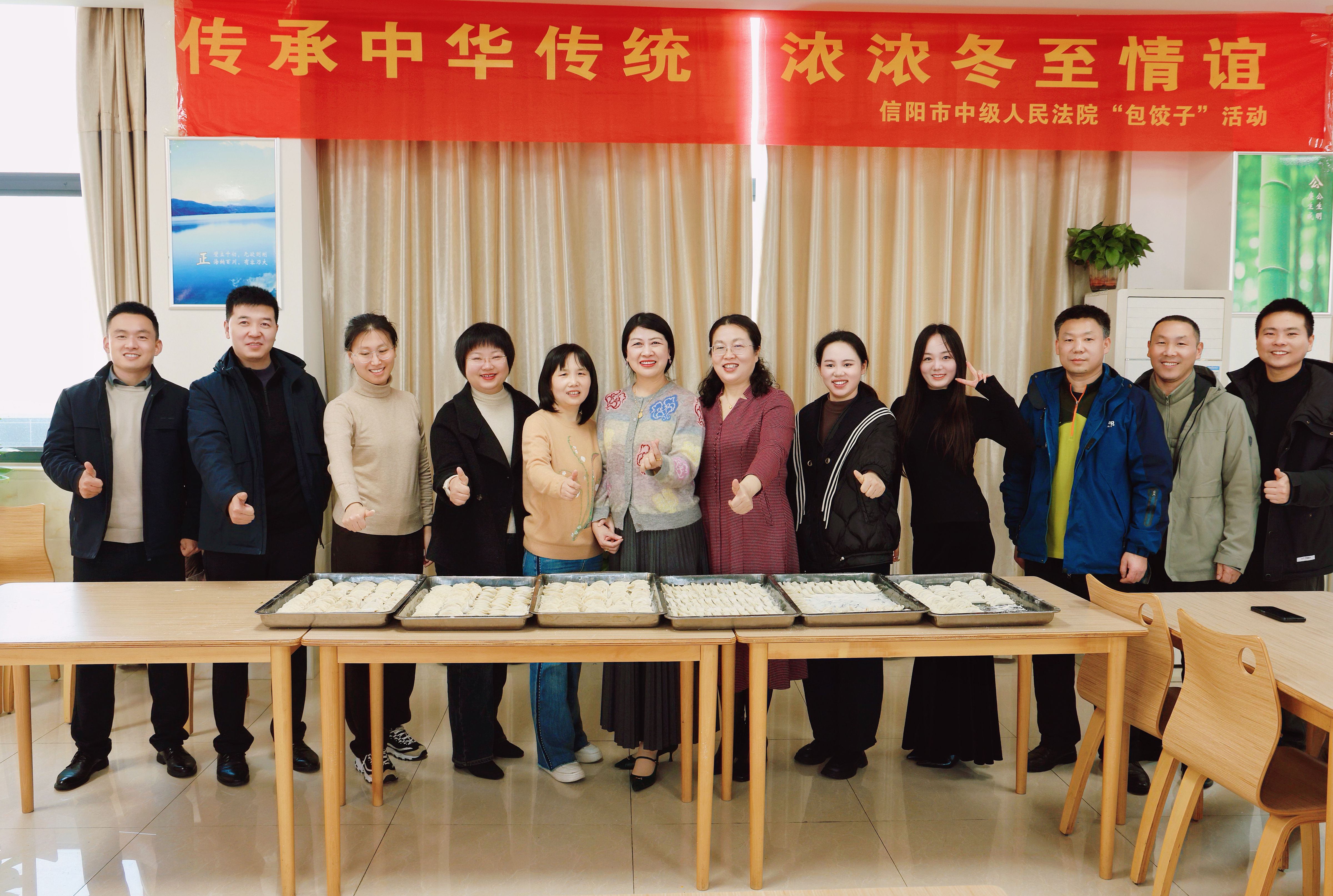 12 月 19 日信阳中院机关食堂暖意氤氲,“传承中华传统 浓浓冬至情谊” 的红色横幅格外醒目,一场热闹的包饺子活动在这里温情启幕,部分干警欢聚一堂,共庆冬至佳节。