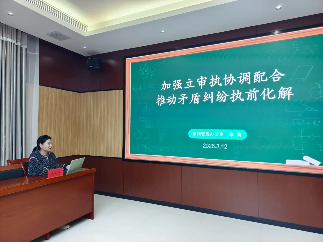 审管办主任李青以《加强立审执协调配合,推动矛盾纠纷源头化解》为题,为院党组带来一堂"干货满满"的专题课。从政策精读到现状剖析,从问题梳理到路径优化,李青结合全市法院审判执行实际,为畅通立审执衔接、提升纠纷化解质效开出了"诊断书"和"处方笺"。