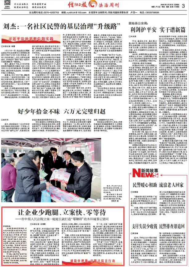 法治是最好的营商环境,司法是护航发展的坚实保障。信阳中院坚决贯彻市委动员与省法院“夯实基务实功求实效”工作部署,将“动员令”转化为“行动书”,以破除司法服务“中梗阻”为抓手,聚焦立案、审判、执行、治理全链条,出硬招、办实事、求实效,全力打造“零干扰”法治环境、“零障碍”司法环境、“零延误”办事环境,以司法担当为“打造豫南开放门户、争做老区发展先锋”保驾护航。近日,信阳中院联合信阳日报开设“破除中梗阻·信阳法院在行动”专栏,对话一线干警,全景展现信阳两级法院“硬核”司法破梗阻,法治护航 “软环境”的生动实践。