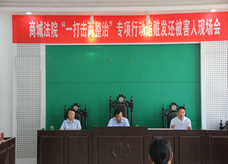 目前,全省法院正在进行“一打击两整治”专项行动,为认真贯彻落实全省“一打击两整治”专项电视电话会议精神和商城县“一打击两整治”专项行动方案,推动“一打击两整治”深入开展,河南省信阳市商城县人民法院在综合审判楼公判庭举行了追赃发还被害人现场会,将近期追回的的7余万元赃款发给了15名被害人。现场会由商城县法院刑事审判庭副庭长卢颖主持。会上,商城县法院副院长明德奎作了讲话,他要求法院刑事审判干警要在“一打击两整治”专项行动中发挥主力军作用,充分运用刑事审判职能,不断创新管理模式,坚持打击与保护并重,鼓励广大人民群众与犯罪分子作斗争的信心。在严厉打击刑事犯罪的同时,也要着重维护被害人的利益,注重挽回被害人的损失,减少犯罪造成的不良社会后果,最大限度的使受害人的损失得到补偿。今年以来,商城县法院刑事庭共为受害人追回经济损失40余万元 。