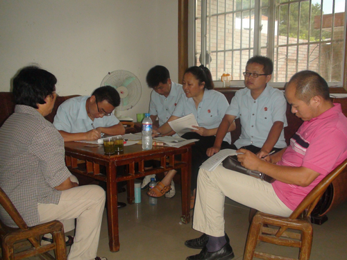近日,新县法院民一庭法官从当事人利益出发,考虑天热,免得当事人走更多的路,他们带着卷宗来到一农户家中对该农户宣告其子失踪一案进行开庭审理。图为开庭现场。