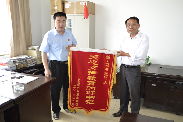 为响应全国选派机关干部去基层农村帮扶脱贫的号召,三年前,浉河区法院干警宫杰斌来到十三里桥乡汤庙村担起了“第一书记”的重任。转眼三年过去,日前,汤庙村村支书周恒元与汤庙小学校长郭承国一行来到浉河区法院送来了锦旗,向这位特殊的书记表达村民们衷心的感谢。