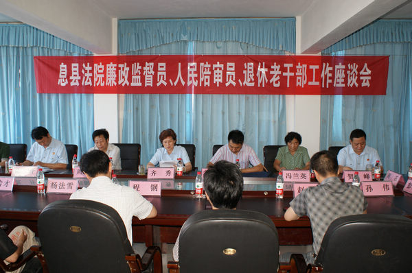 为认真深入学习贯彻全国高级法院院长会精神,加大司法作风监督力度,切实纠正干警在作风纪律方面存在的问题,确保公正司法。2013年7月11日下午,息县法院选择了来自不同岗位的部分廉政监督员、人民陪审员、律师和本院退休老干部召开座谈会,面对面地听取意见和建议,共谋该院廉政建设发展新思路。