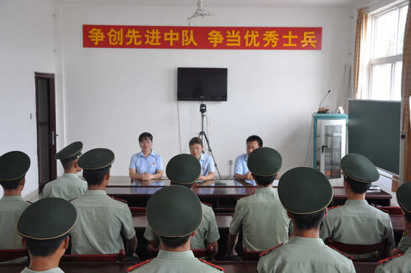 7月30日上午,河南省罗山县人民法院副院长梅传莉带领涉军维权法官来到武警罗山县中队开展“送法进军营”法律知识辅导和法律咨询活动,为武警官兵送去法制宣传材料、涉军维权联系卡和慰问金,受到了武警官兵的热烈欢迎。