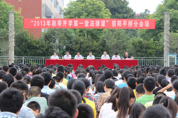 9月2日上午,平桥区五中迎来了由平桥区法院送来的“2013年秋季开学第一堂法律课”,平桥区法院院长周启明作为主讲老师,结合青少年身心特点,为该校3500余名中学生上了一堂生动的法律课。