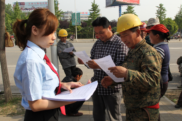 5月8日上午,河南省信阳中院民三庭和刑三庭的法官们带着宣传资料来到红军广场附近的一个农民工劳务聚集地,开展“维护农民工合法权益”专项活动,向现场的农民工兄弟发放维权宣传单200余份,并就签订劳务合同应注意的事项、发生争议时的解决途径、起诉需要符合的条件和举证要求等维权技巧和方法提供法律咨询40多人次。法官们同时希望农民工理性对待欠薪、工伤等劳动纠纷,充分运用法律手段维护自身合法权益,切莫采取过激方法。