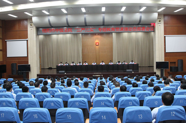 为贯彻落实中央、省委、市委和上级法院安排部署,加强法院干部队伍建设,5月26日下午,信阳中院党组书记、院长张社军以“自觉践行‘三严三实’ 争做邹碧华式的好法官”为题,给中院全体干警上专题教育党课,并对全市法院开展专题教育作出安排部署。中院在家的党组成员、专职审委会委员以及全院干警参加了会议。