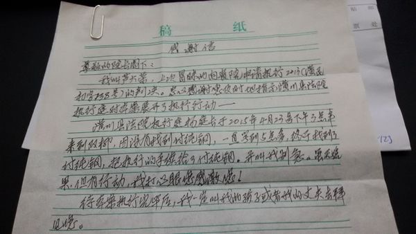 看到自己的困难因为一封求助信而逐步在解决中,申请人芦某非常感动,遂向张社军院长寄来感谢信。
