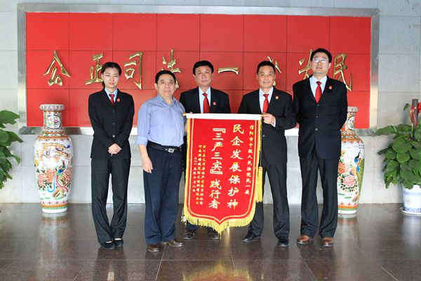 “三严三实”践行者 民企发展保护神 信阳中院民一庭获赠锦旗 作者:民一庭 发布时间:2015-10-20 17:03:34