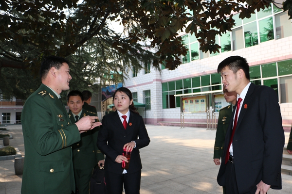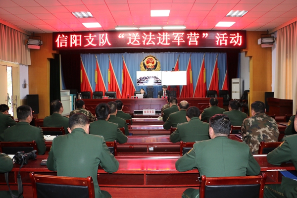 为进一步开展“双百千万”法律服务进基层活动和推进涉军维权“信阳模式”,3月25日,信阳中院法官到信阳武警支队驻地,以“道路事故安全实务与案例”为主题,开展“送法进军营”活动,并通过视频系统向十个县区武警中队同步直播,信阳市县800余名武警官兵共同接受法制教育。