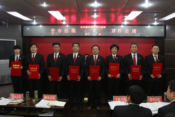 4月15日,信阳中院召开全市法院党风廉政建设和反腐败工作、宣传工作会议,总结2015年度全市法院党风廉政建设和反腐败工作、宣传工作,安排部署今年全市法院党风廉政建设工作、宣传工作。中院党组书记、院长张新中、中院党组成员、政治部主任奚启锋、中院党组成员、纪检组长张维民,各县区法院院长、纪检组长、宣传部门负责人、中院各部门主要负责人及中院监察室、宣教科全体工作人员参加会议。会议由中院党组副书记、常务副院长王玉明主持。