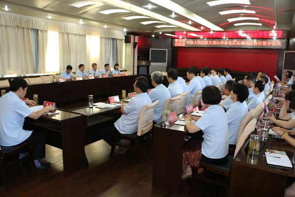 为进一步贯彻落实最高院院长周强在鄂豫皖革命老区涉军维权座谈会上的重要讲话精神,细化和完善两地政府振兴发展大别山革命老区的战略合作协议,6月22日,信阳中院与黄冈中院举行大别山革命老区区域司法协作签字仪式,信阳中院党组书记、院长张新中、黄冈中院党组书记、院长贾石松代表双方签字并讲话。信阳中院党组成员、专职审委会委员、各部门负责人及商城县法院院长李振、新县法院院长郑镇林,黄冈中院党组成员、政治部主任夏冬华、研究室副主任王林浩、张瑾,麻城法院院长程兵、红安法院院长黄明律,参加签字仪式。中院党组副书记、常务副院长王玉明主持签字仪式。