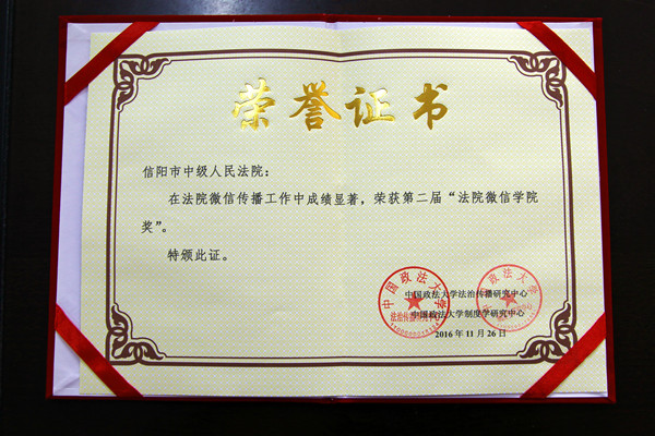 11月26日,第二届全国法院新媒体学院奖颁奖礼在北京举行,信阳市中级法院荣获“第二届法院微信学院奖”,且名列该奖项榜首,是河南唯一一家获此殊荣的法院,也是全国二、三、四线城市中唯一一家获此殊荣的法院。