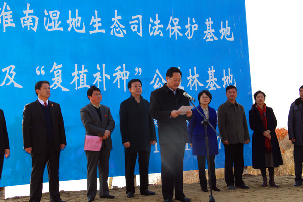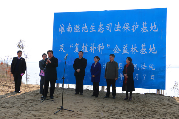 12月7日上午,淮滨县人民法院淮南湿地生态环境司法保护示范基地及复植补种公益林基地正式揭牌。信阳市人大常委会副主任詹玉锋、信阳中院党组书记、院长张新中、省高院环境资源审判庭庭长徐哲、信阳中院党组副书记、副院长冯琦、淮滨县法院党组书记、院长王大志,以及市县两级人大、政协代表和县相关单位负责人参与了此次揭牌仪式。淮滨县委常委、政法委书记李新民主持揭牌仪式。
