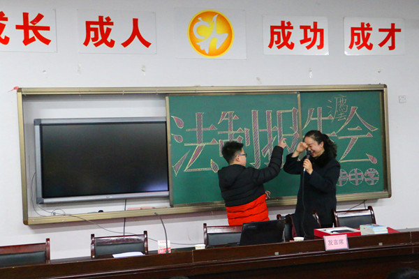 以“用法治的力量呵护青少年成长”为课题,陈鑫用生动风趣的语言向听课师生普及法律知识,还向同学们传授几个简单而又实用的防身术,手把手现场示范,提高同学们自我保护能力。朱虹给学生代表穿上法袍,递上法槌,让他们亲身体验法官的权威和法律的威严。